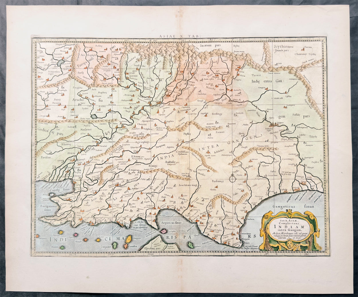 Description:This original copper plate engraved hand coloured antique Ptolemy map of India & Subcontinent, after Claude Ptolemy's Geographia was published in the Helma Strick edition of Geographia in 1695.These maps, after the 1st century text by Claude Ptolemy, were first published by Gerard Mercator in 1578 edition of Geographia by Gottfried von Kempen