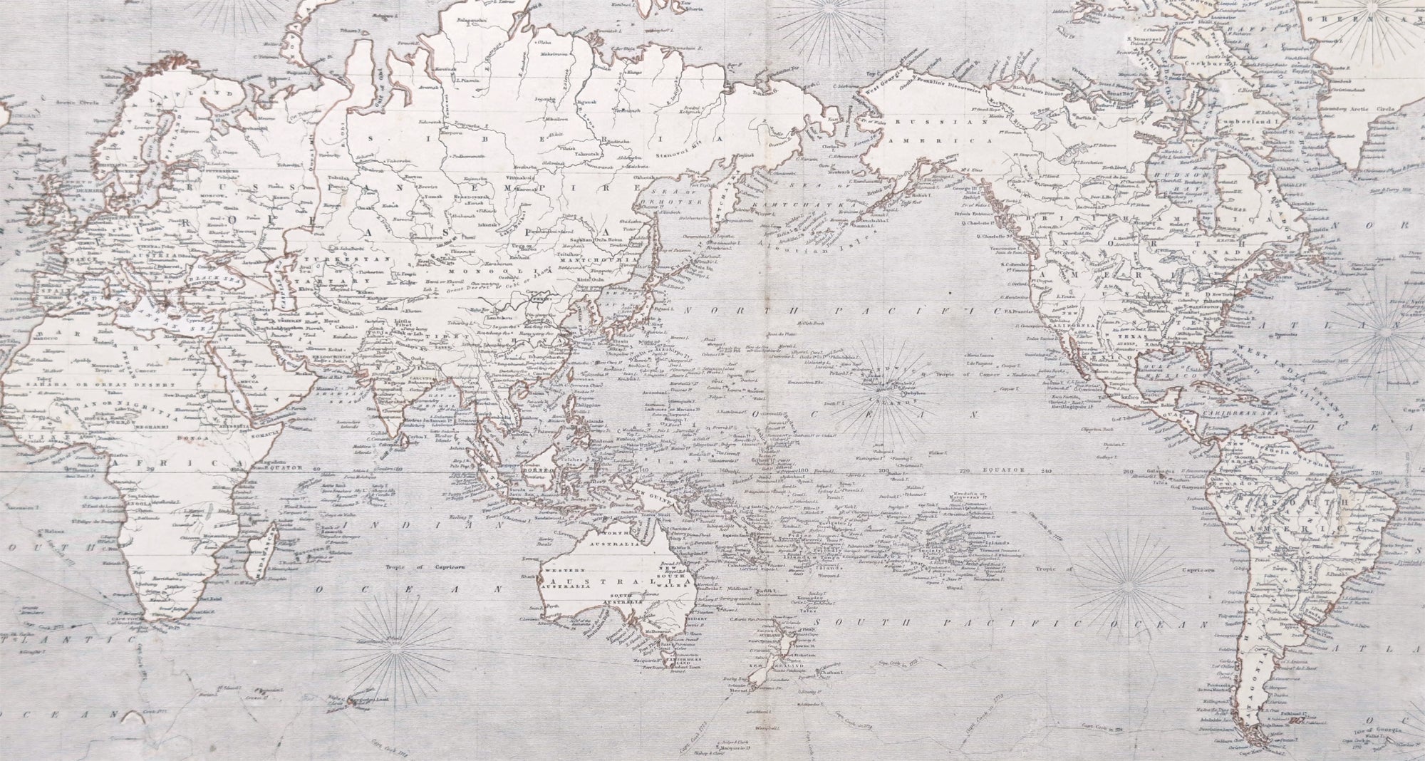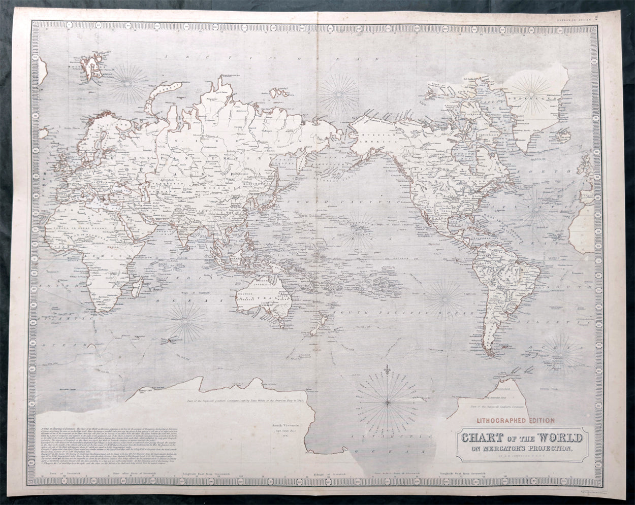 Description:This large original 1st edition, uncommon hand coloured antique lithograph world map was published by W & AK Johnston in his General Atlas, 1844.A Pacific centered map emphasising the contemporary nation of Texas in North America, a few years prior to joining the union, along with the latest discoveries in Antarctica, or Southern Continent (as it was then known) by Charles Wilkes (1840) and James Ross (1841)